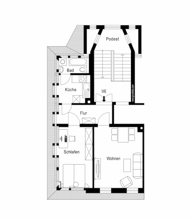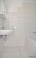 Das Bad ist gefliest und mit Wanne, WC und Waschbecken ausgestattet. Neben Wohnzimmer und Schlafzimmer verfügt die Wohnung über einen Flur, eine Küche mit Fenster und einen Abstellraum im Treppenhaus. Ein Kellerraum gehört ebenfalls zur dieser Wohnung. Flur, Wohn und Schlafzimmer sind ausgestattet mit Laminat, Küche mit PVC Belag.
