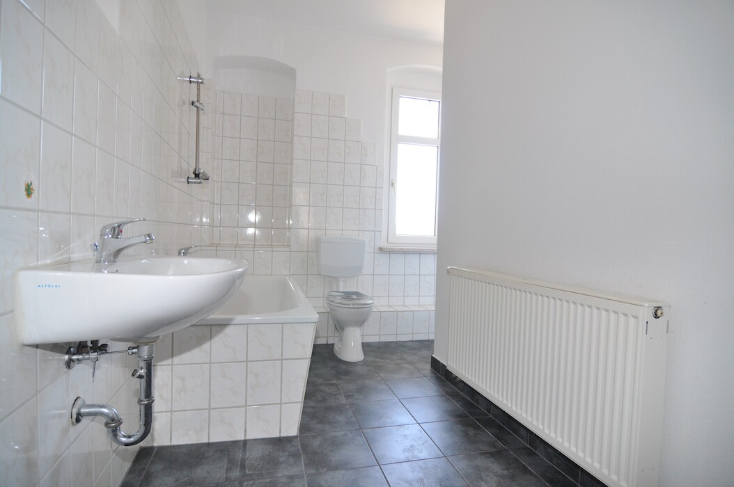 Das große Bad mit Fenster ist hell gefliest und mit Badewanne,WC und Waschbecken ausgestattet.